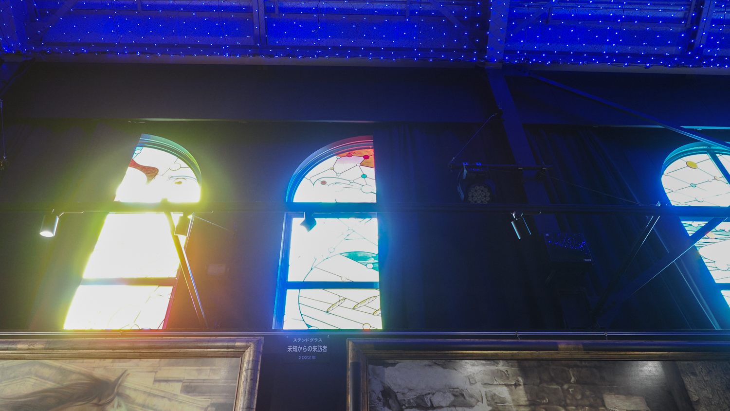 壁一面のステンドグラス「宇宙と銀河」とも相まった独創的なイメージが広がっています。