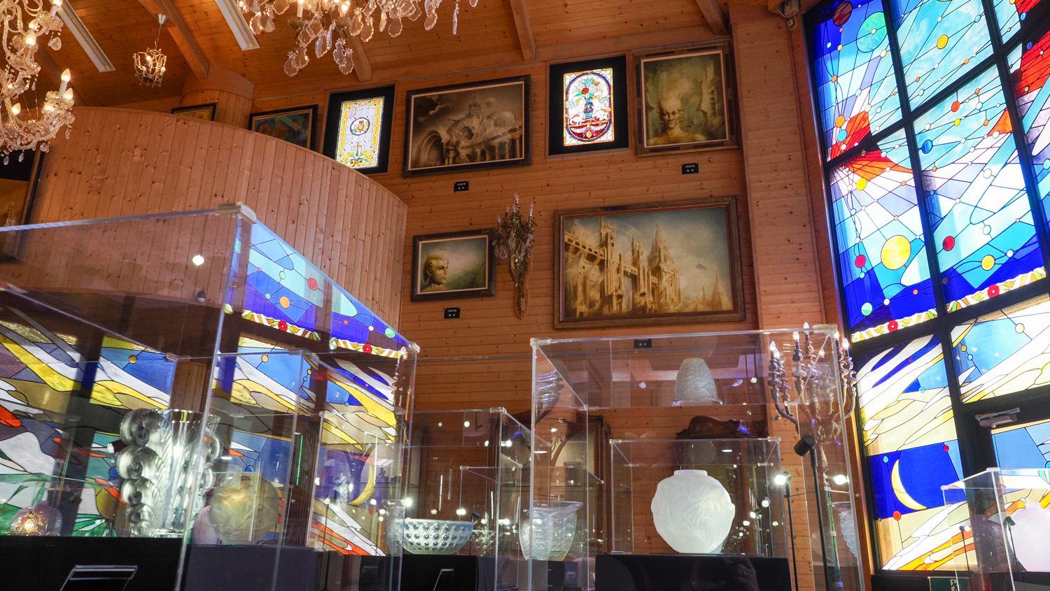 吹き抜けのホールには、ステンドグラスや豪華シャンデリア、そして貴重な工芸品に囲まれながらルネ・ラリック作品が展示されています。
