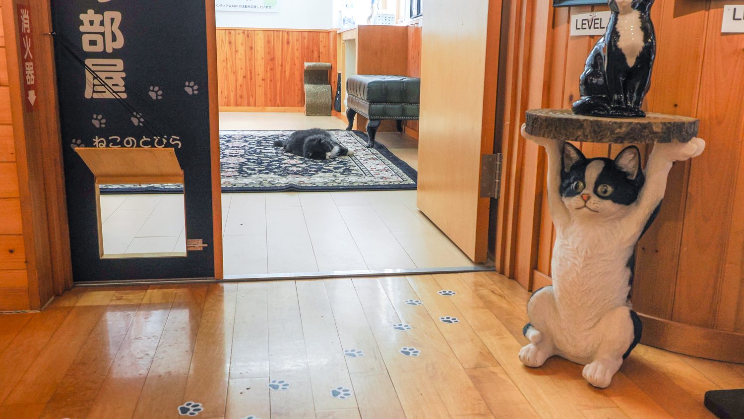 目に入ったのは、気持ちよさそうに床に寝そべっている看板ネコ"マスク"。