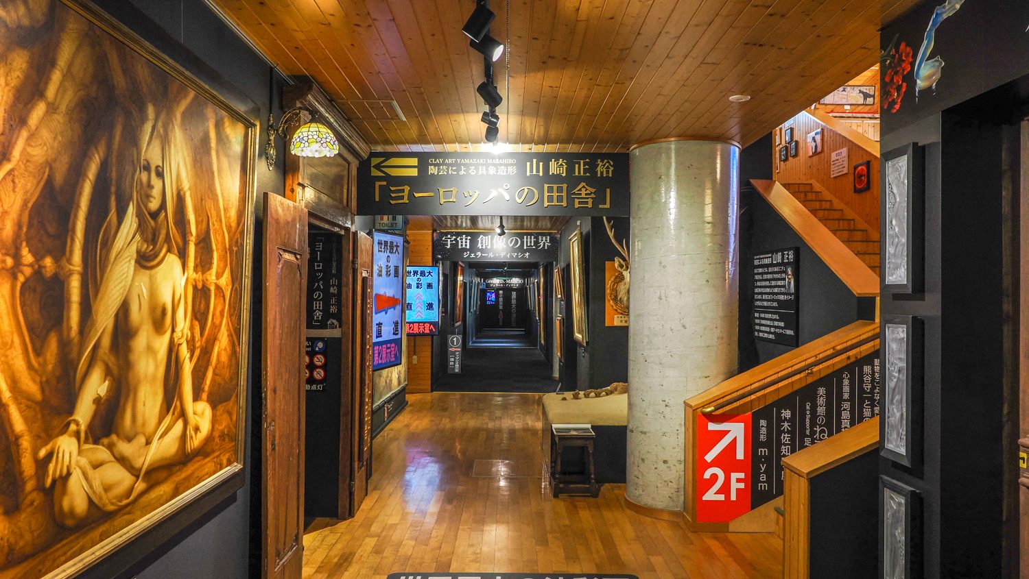 吹き抜けのホール両サイドの壁には、ガラス工芸品を見守るかのように飾られたディマシオの幻想画。