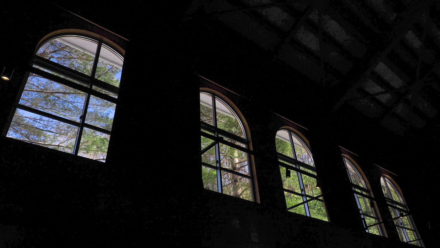 ViewoftreesandskyfromthewindowoftheexhibitionroomwhereDi-Maccio'sworksandcontemporaryabstractartworksareondisplay