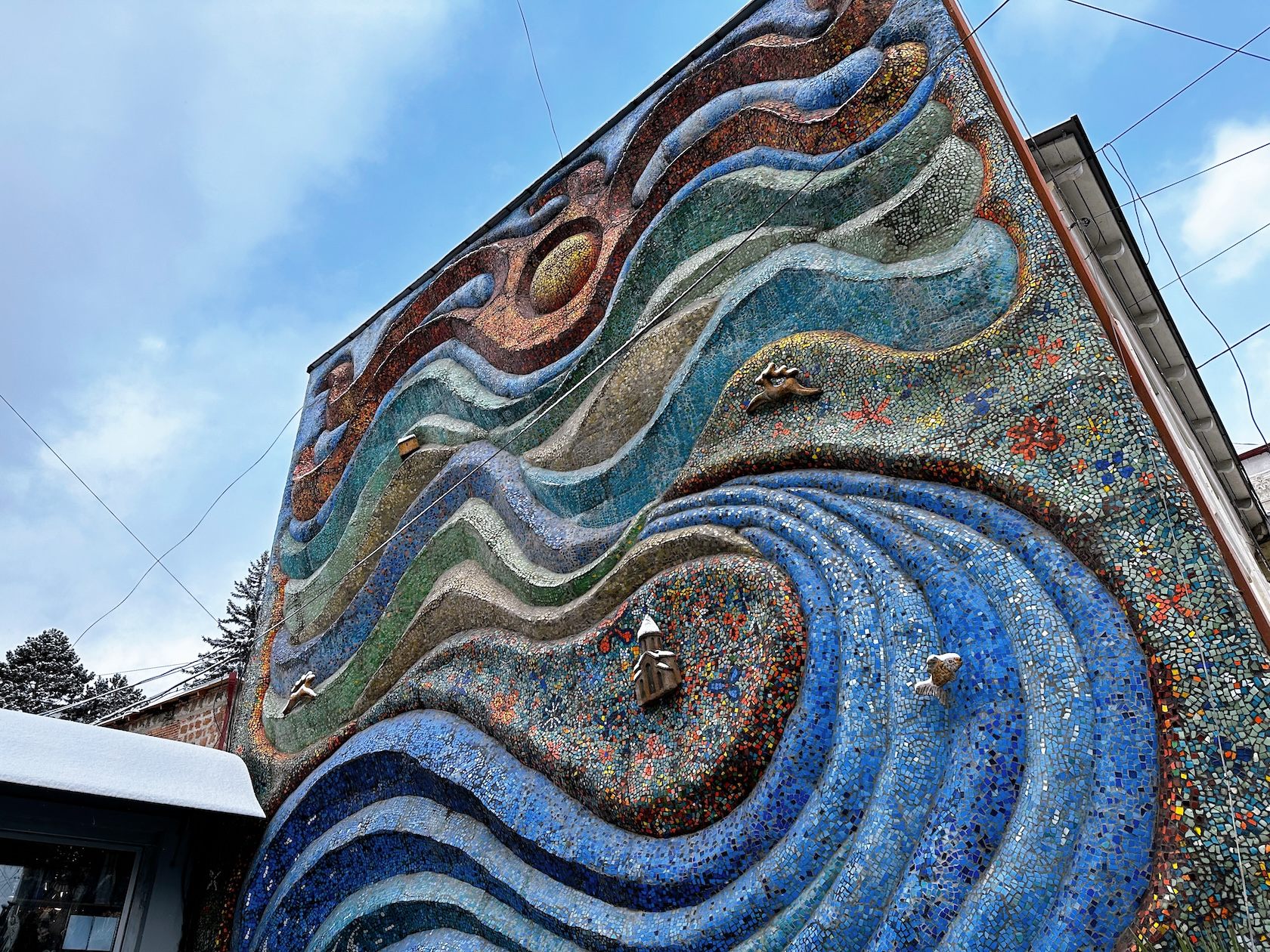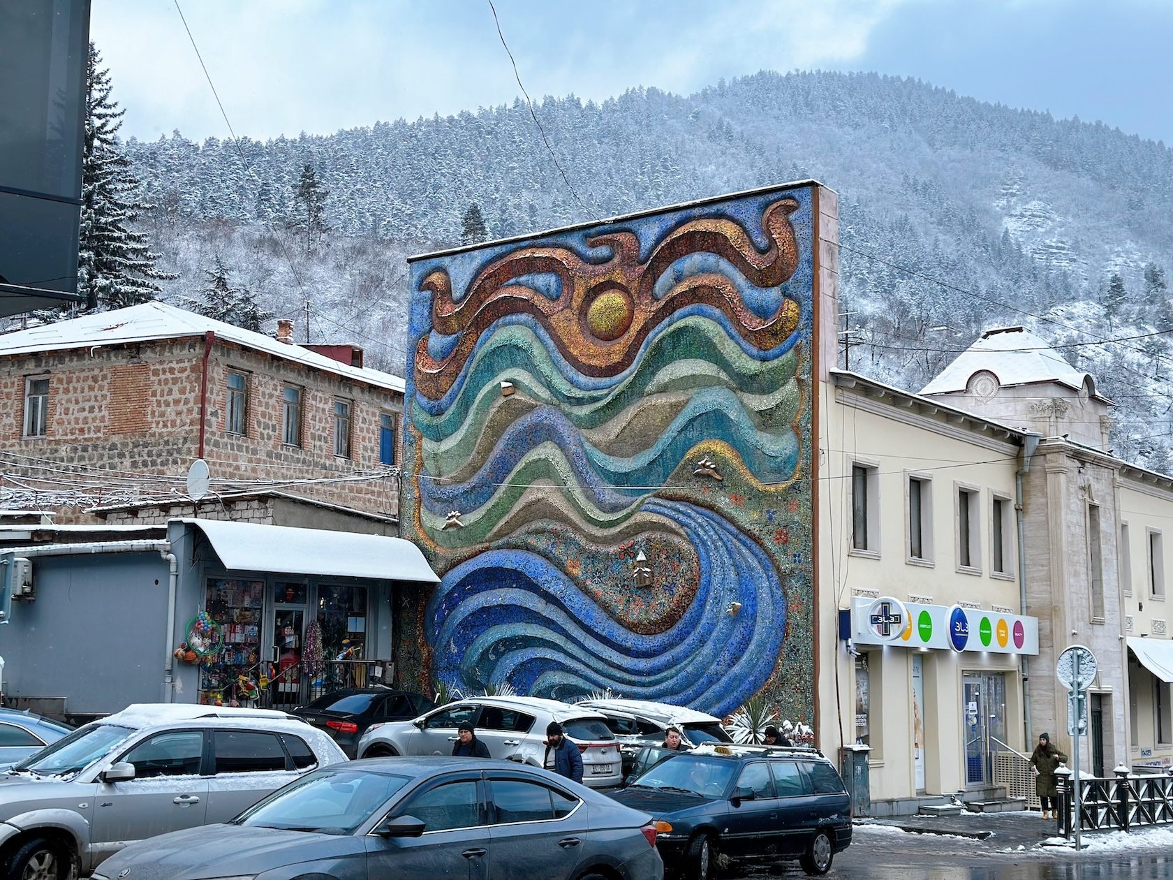 ボルジョミにはモザイク画が中心街や公園などに点在していますが、いちばん目を惹く大きな作品は、冒頭の写真の作品で、町中心部のスーパー(გუდ მარტი:Good Mart)横にあります。