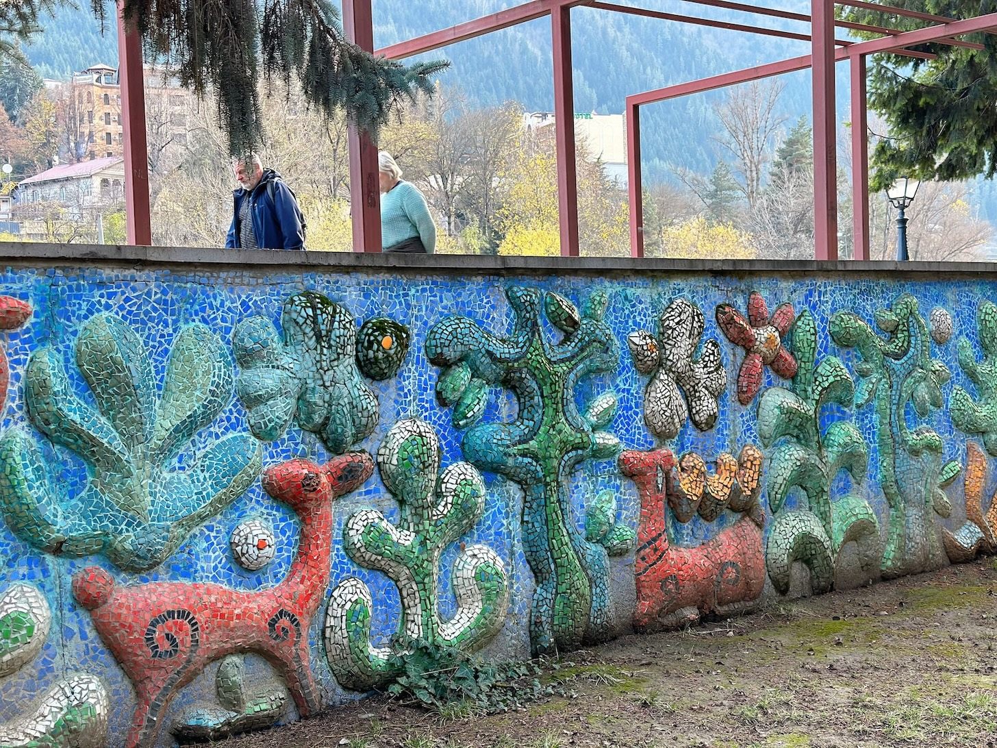 モザイク画は、首都トビリシの建物でも多く見られますが、ここボルジョミにも高さ10mほどの巨大な作品から、小さな作品まで町中に点在しており、そして作者がボルジョミ出身のジョージアで有名な彫刻家なのです。