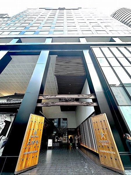 御堂筋側のエントランスには山門を模したカンデオホテルズと三津寺の看板が設置されています。エントランスを入ると、街とお寺とホテルをつなぐ境内です。
