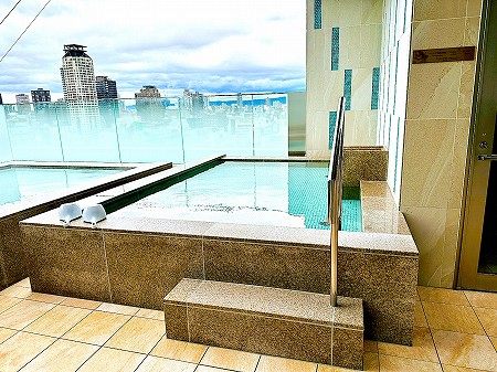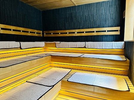 広々とした展望露天スペースの中に男女共通・オートロウリュ式のサウナが設置されています。展望露天風呂、サウナ、水風呂、外気浴がスムーズに行えます。