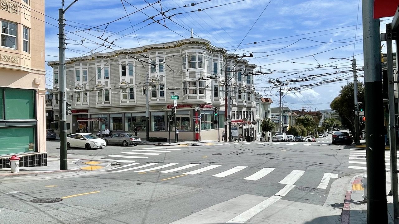 ヘイトStをマーケットSt方面に歩いて、ブエナビスタパークも過ぎフィルモアStから#22のミュニバスでマーケットSt。カストロ地区に向かいます。
