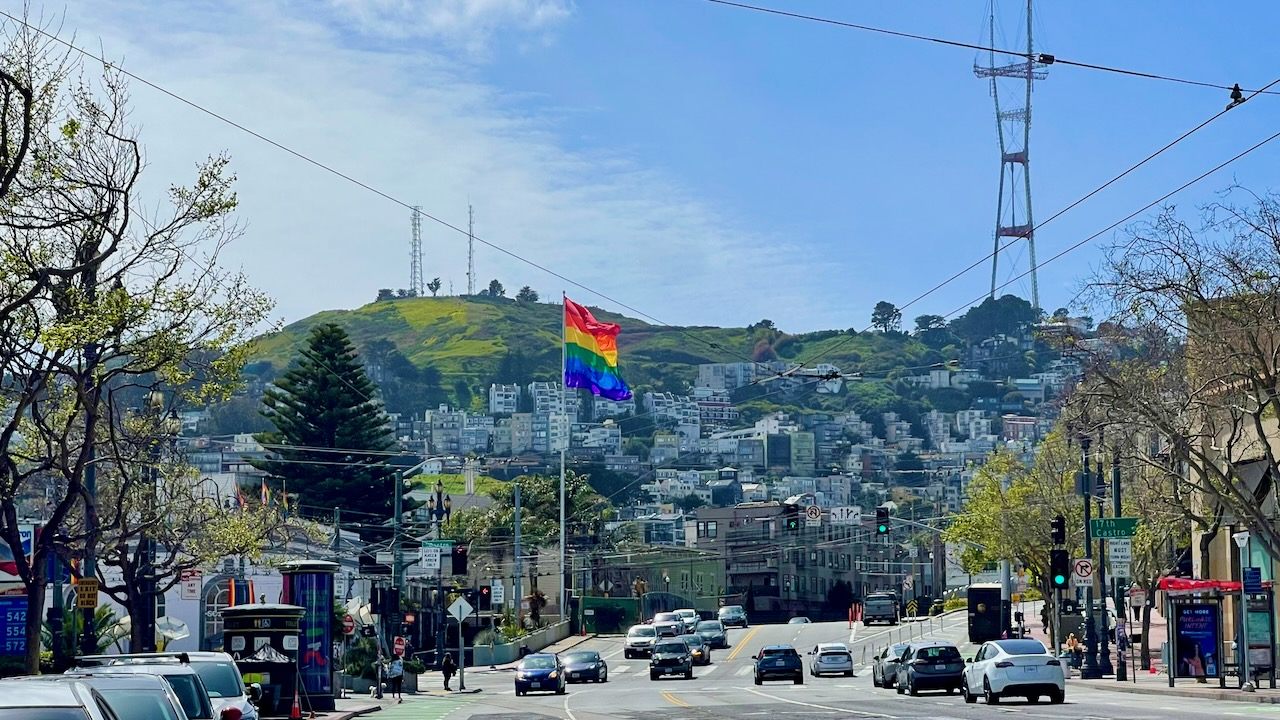 チャーチ&マーケットStで下車。ここからカストロ地区の始まりそこかしこにレインボーフラッグがたなびいています。そのまま、ジャンボフラッグ目指します。