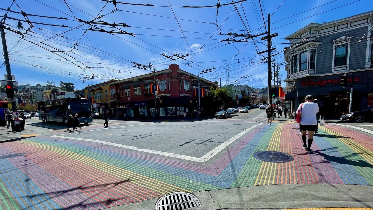 残念ながら、LGBTQやヘイトクライム、マイノリティの方達が事件に巻き込まれ被害に遭う事もあります。そんな時みんなで集まって勇気づけ合う場所になる交差点がここです。今は亡きハーベーミルクもここで選挙演説をしました。この先に彼の経営していたカメラ店があります。