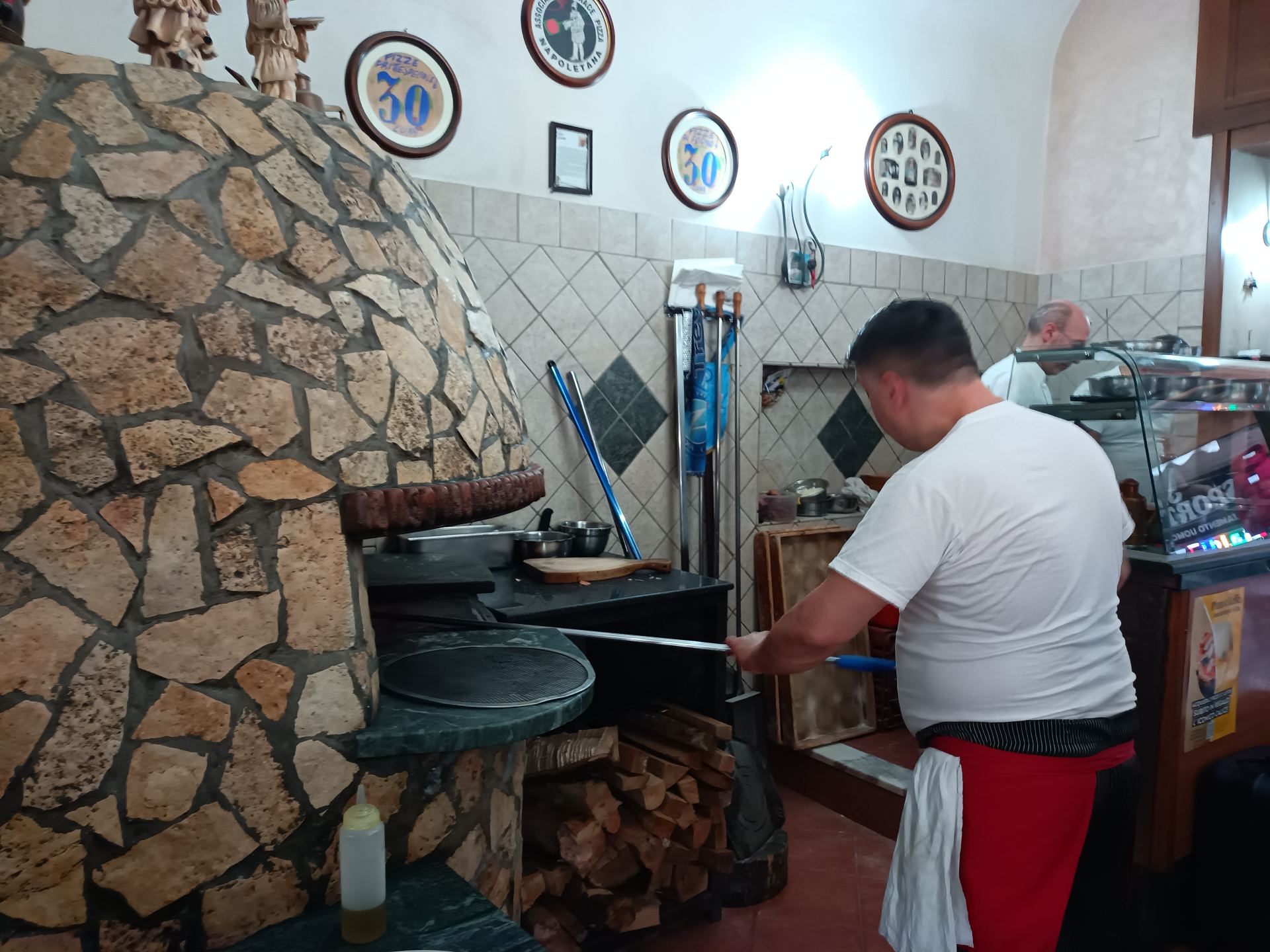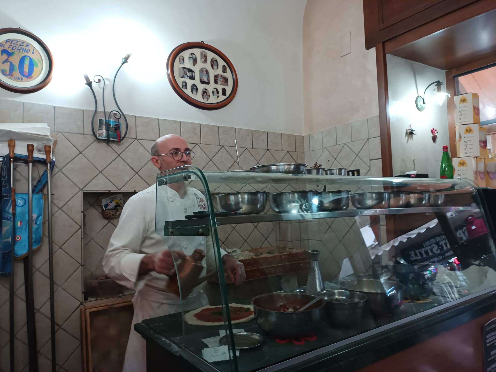 実は日本から知り合いが久しぶりに筆者を訪ねてきました。とてもうれしくて懐かしくて話が弾み、当時のようにタイムスリップしたかのように時間を忘れるくらい話しました。その時に、知り合いがぜひ食べに連れて行ってほしいとリストを作っていたなかに、ここのピッツエリアの名があり、筆者もいつか行ってみたいとは思っていましたが、行かずじまいでしたので、意気投合し行くことに。ナポリ空港までお出迎えし、ちょうどお昼時で並ぶ可能性があったのと、時短を考えた末に、ホテルには向かわずタクシーでピッツリアへ直行しました。