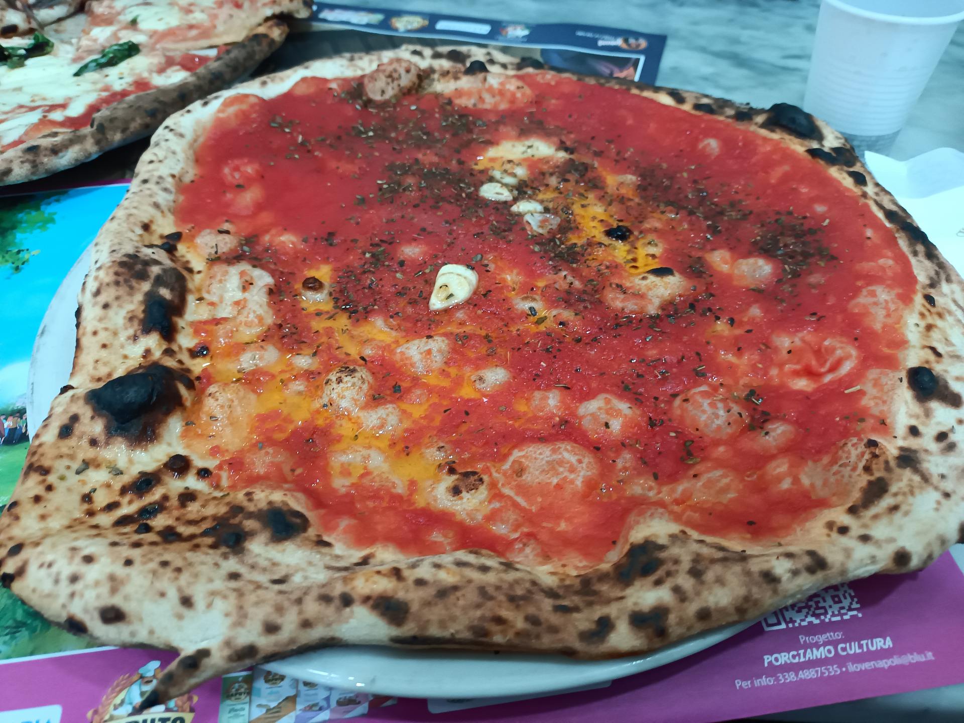 そして店内に入ってもなかなかピッツアは持ってきてくれません、かなり待ちましたが待っている間知り合いと(ネイティブな)会話をしたためあっという間に時間は過ぎました。そして超どでかいピッツアを運んできてくれました。ピッツアの種類は以前はマルゲリータとマリナーラのみでしたが、今回久しぶりに行ってきましたら、コザッカ(モッツァレラチーズなしでパルメザンチーズがかけられている)というシンプルなピッツアもニュー登場していました。