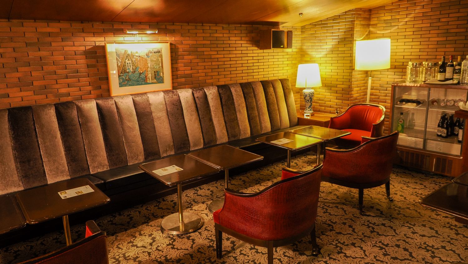 壁のレンガや敷き詰められた絨毯、そしてベルベットのソファは統一感がある色調で、ほのかな灯りのなかに一層映えています。