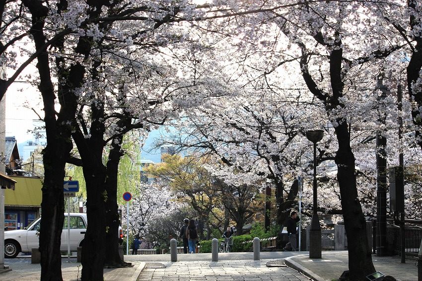 この時期の祇園白川には、総本数43本の桜が咲き、桜のトンネルを作ります。