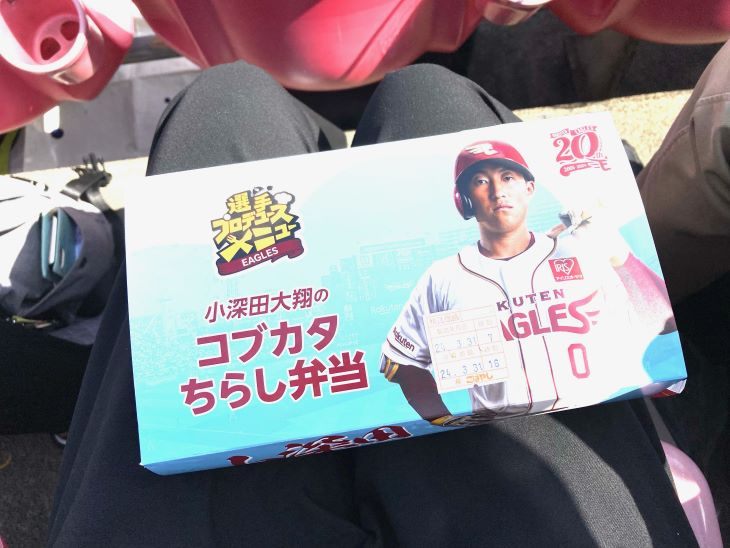 試合観戦の時はスタジアムグルメも楽しみのひとつですが、選手プロデュースメニューもたくさんあります。今回は小深田大翔選手プロデュースの「小深田大翔のコブカタちらし弁当」を食べてみました。