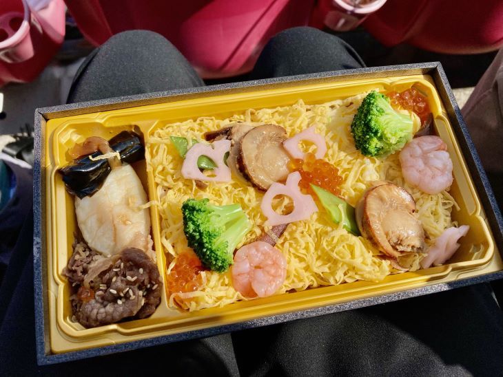 名前にちなんで、コブ(昆布)とカタ(仙台牛肩肉)のおかずに、やわらかいホタテ、海老はお酢がきいていてさっぱり、錦糸卵がほんのり甘く、バランスがよくおいしいお弁当でした。