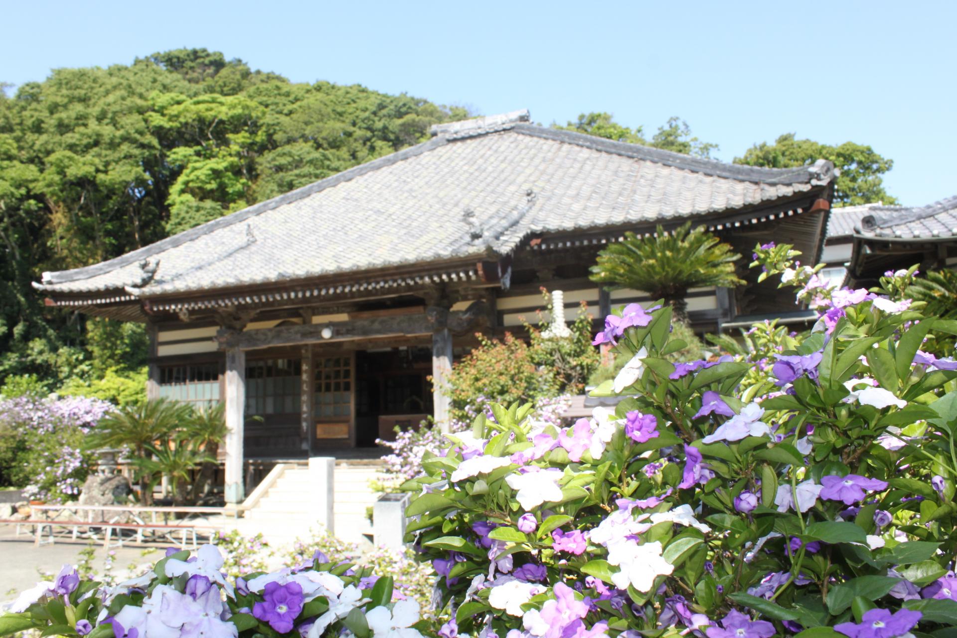 了仙寺は、静岡県南伊豆の下田市にあるお寺で、アメリカジャスミンの名所として知られています。境内から参道にかけて数百株も植えられており、5月中旬から下旬に満開となります。周囲はその甘い香りに包まれて、訪れる人々を楽しませてくれます。