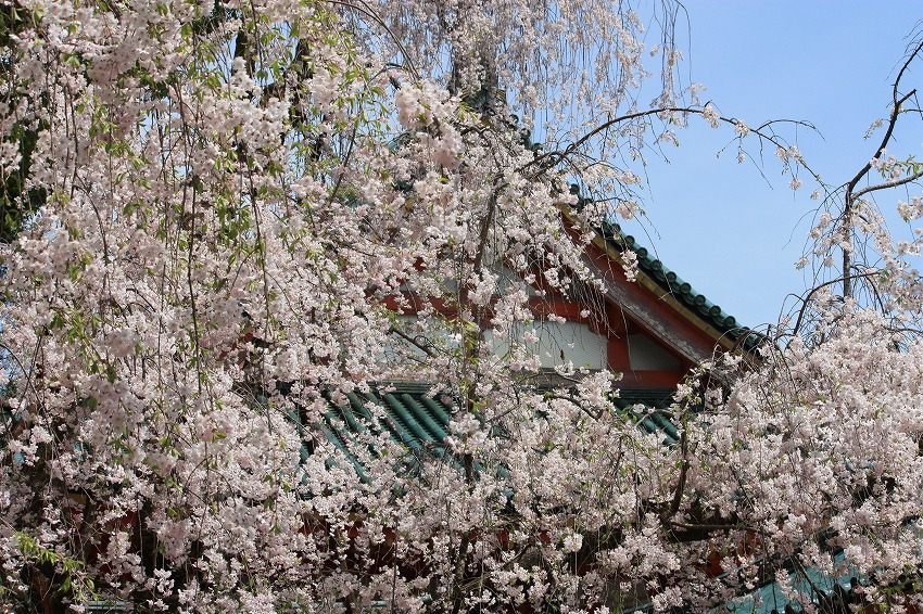紅枝垂れ桜の奥に見えるのは、東神苑の橋としての役割も兼ねる「泰平閣(たいへいかく)」。