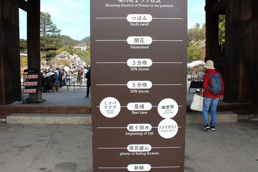 二王門の看板には、現在のソメイヨシノや御室桜・ミツバツツジの開花具合を、