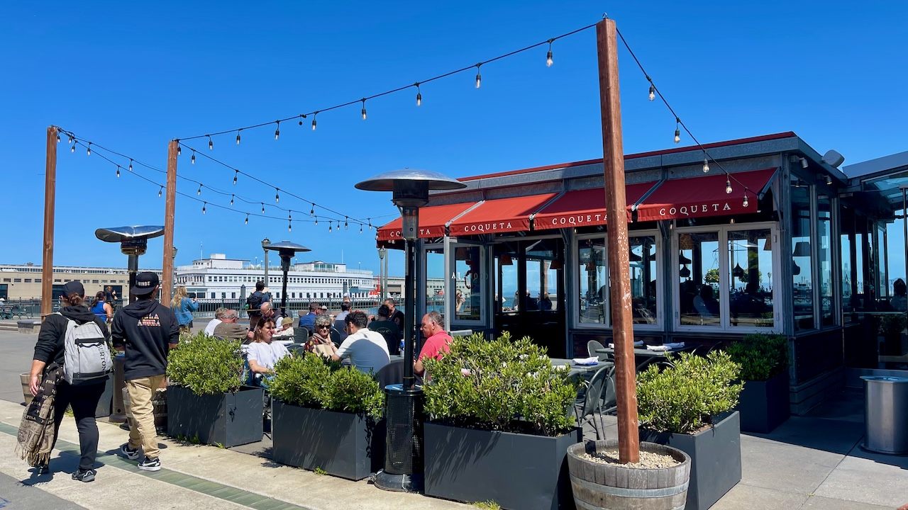 エンバカデロSt沿いで、フェリーターミナルからも歩いていけるピア5にあるスパニッシュタパスの「コケタ(Coqueta)」。なんか日本人には笑っちゃいそうな名前で覚えやすいです。スペイン語で浮気とか夢中とかって意味らしくちょっとびっくり。店内は桟橋の倉庫を改造してるので天井が高く、どんなに混んでいてもゆったり空気です。オフィス街に近いこともあって、平日の12時頃パティオもダイニングも次々と席が埋まっていきました。カジュアルなビジネスランチにも利用されているようです。