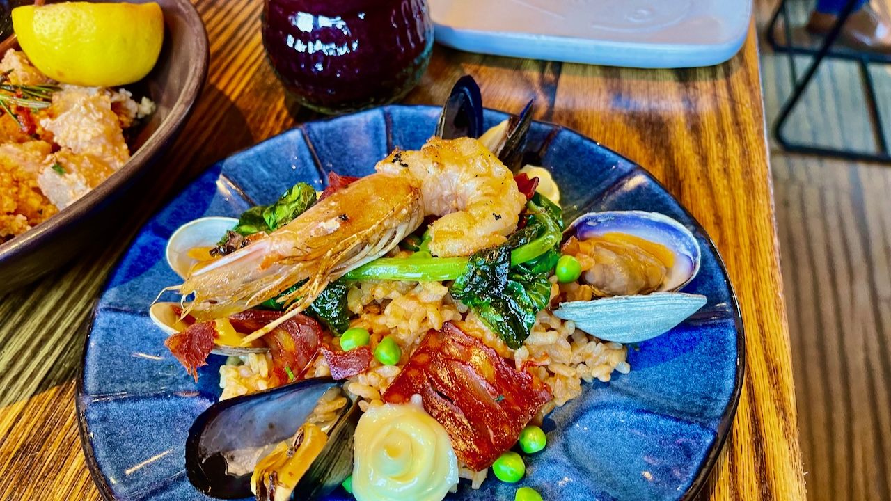 ・雛鳥&シーフードのパエリア、アスパラガス、マッシュルーム、グリーンガーリック添え