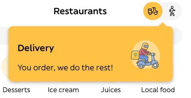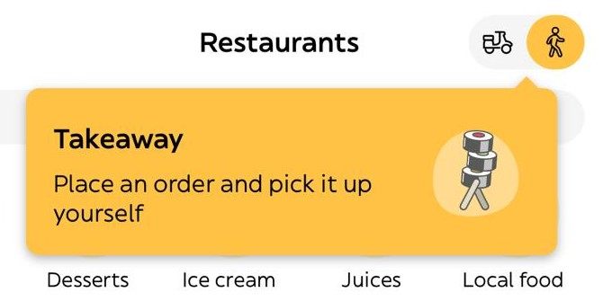 また、黄色で塗られた右上のバイクをタップし、歩く人型を黄色の状態にすることで、自分で注文をピックアップする設定に変更されます。日本で言うところの「モバイルオーダー」に相当するでしょうか。当然ながらこの場合配達料は発生しません。