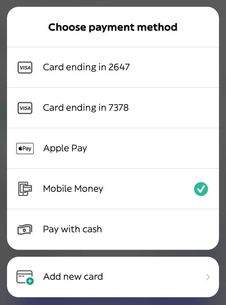 支払い方法は4種類。クレジットカード(デビットも可)の他、Apple Pay、モバイルマネー、現金から選択が可能です。モバイルマネーはAirtel UgandaとMTN Ugandaの2種類が使用可能です。モバイルマネーでの支払い時には手数料が追加で請求されます。