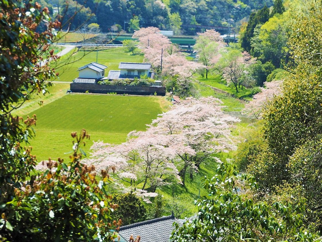 拝殿前から麓を臨むと、桜並木が国道53号線から延々と続いています。この桜並木の奥は津山線が走っているので撮り鉄のスポットのひとつです。車のとおりも比較的少ないのでゆっくりと歩いて散策するのに向いています。この並木道はさらに山側へ進むと川が流れ、渓谷となり滝を見ることもできます。