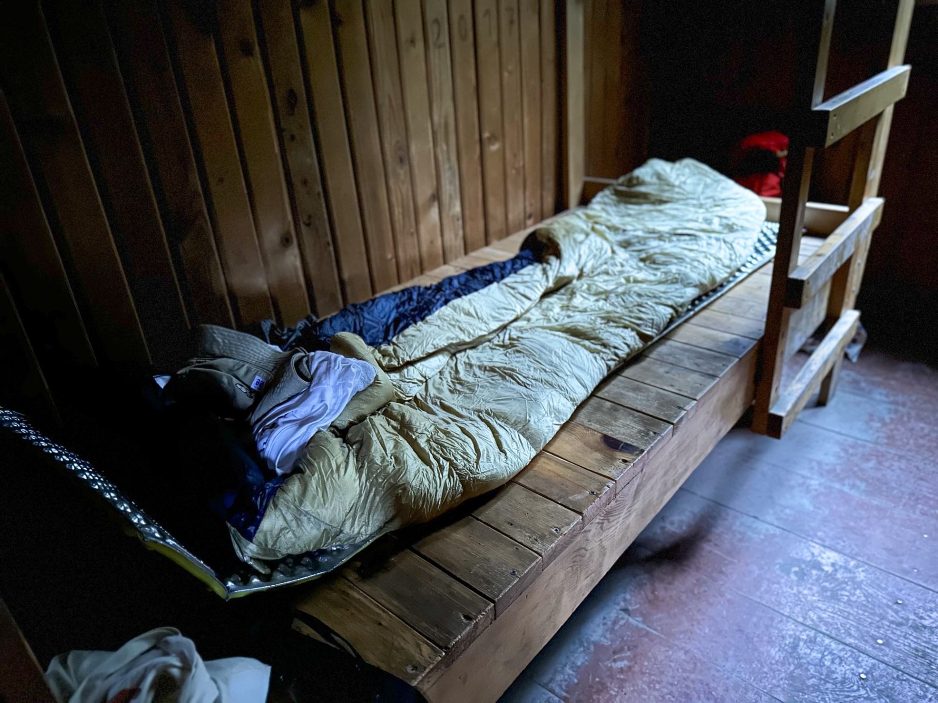 山小屋には木造の二段ベットのみがあり、寝袋やインフレーターマット(キャンプマット)、温かいものが食べたい場合はガスバーナーなど、必要なものはご自身で持参ください。