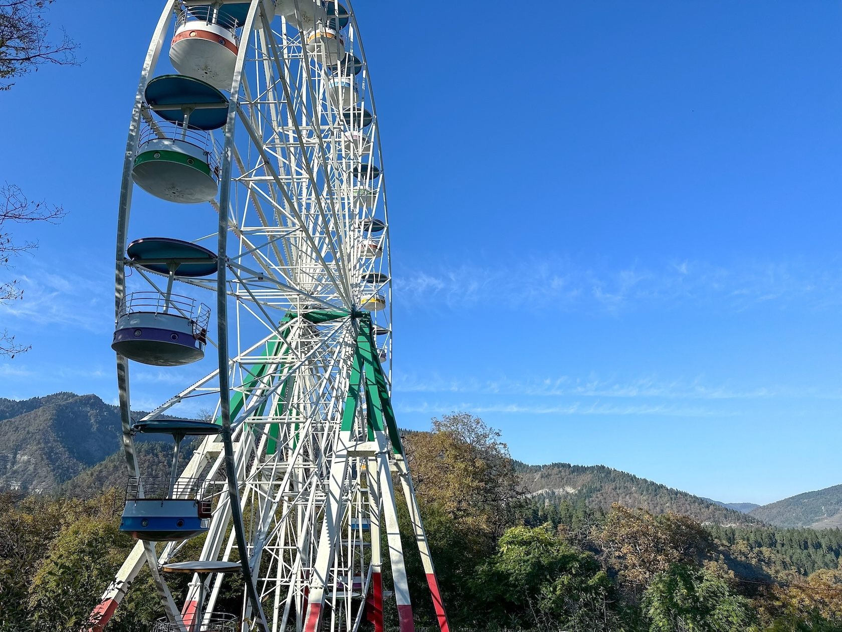ケーブルカーを降りると、左右に車道が続いているので、車に気をつけながら頂上のケーブルカー駅を背に、左に進みましょう。少し左に行くと、大きな観覧車が現れます。最近まで運行していた様ですが、筆者が訪れた際は、止まっていました。