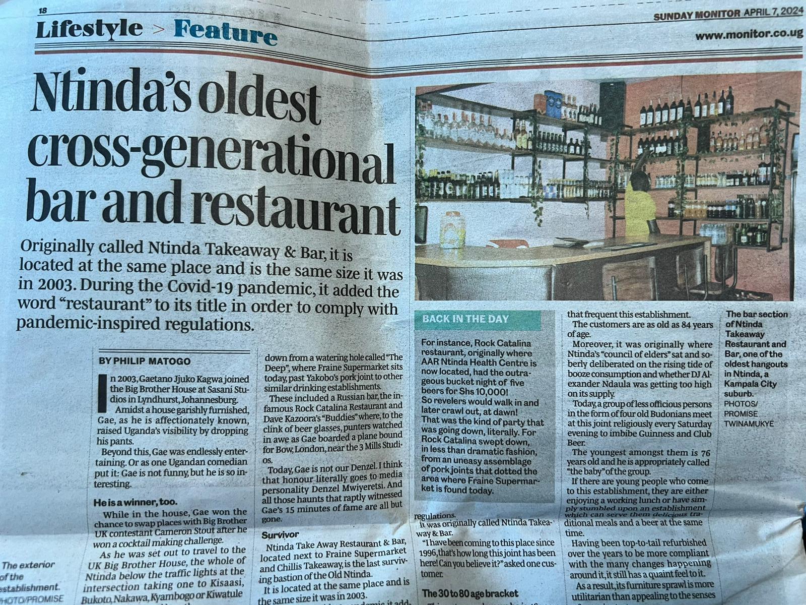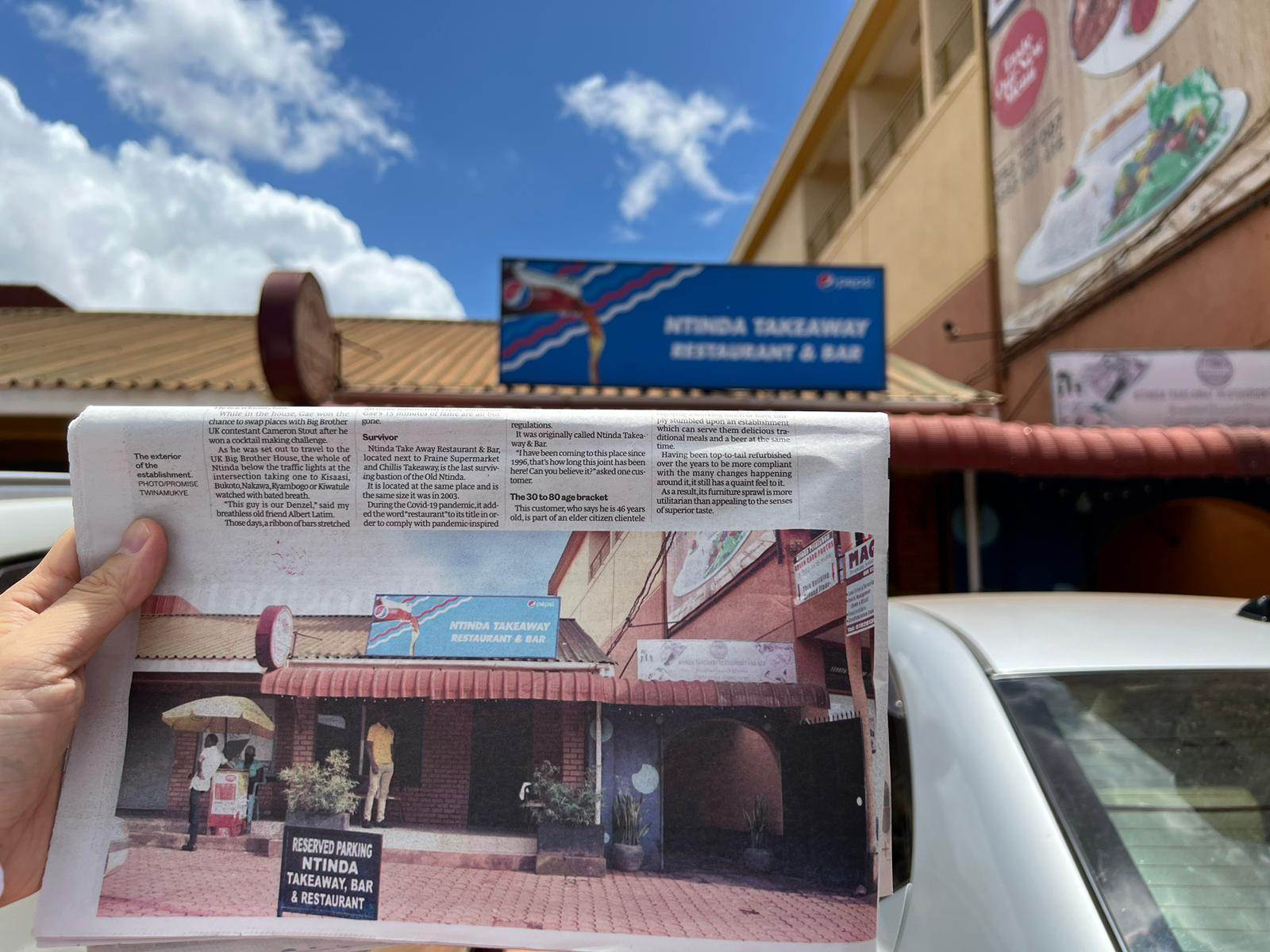 首都カンパラ北東部に位置するンティンダ(Ntinda)を訪れました。多くの小売店や飲食店が軒を連ねる活気のある地域です。朝刊の記事で「Ntinda's oldest cross-generational bar and restaurant(世代を超えて愛される、ンティンダ最古のバー & レストラン)」等と紹介されていたため、どうしても行ってみたくなりました。