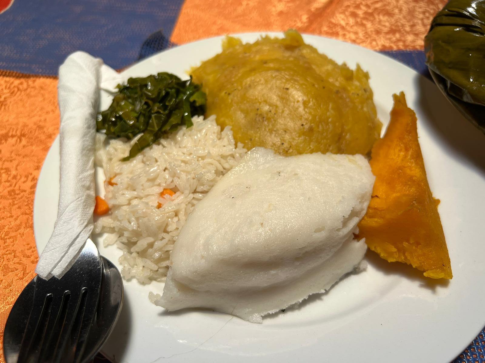メニュー表記上は単なる「フード」となっていますが、当地では主食を意味するようです。複数の主食の中から好きな物を3つ選んで注文します。マトケ、ベジタブル・ライス、ポショ、キャッサバ、サツマイモ、じゃがいも、カボチャなどから選択が可能です。マトケ等は冷めると少し硬くなってしまうため、熱々のルウォンボに浸していただくと素晴らしい食感と味覚のハーモニーが出来上がります。