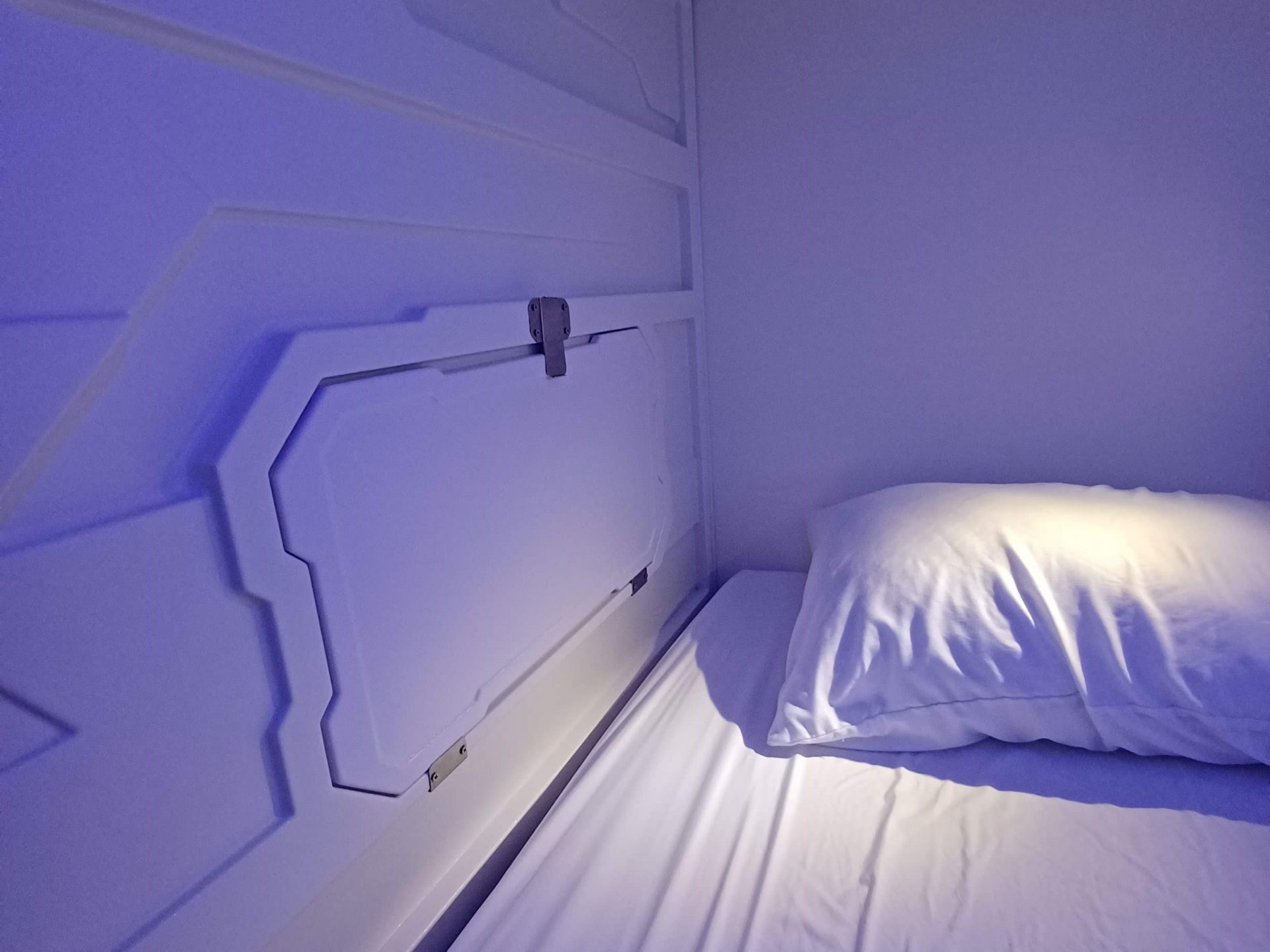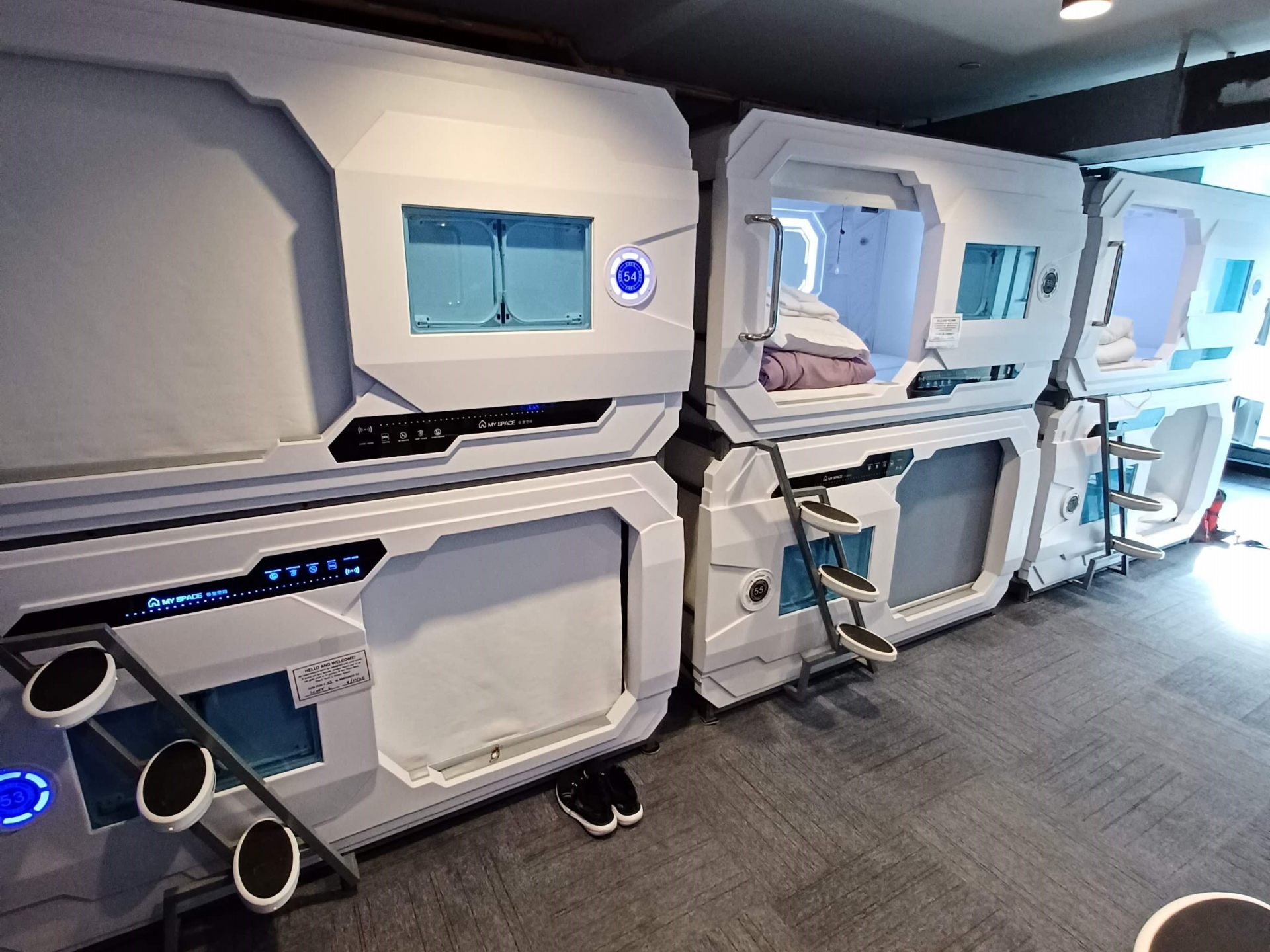カプセルの作りは出入り口が縦向きと横向きがあり、予約時に選択することができます。上段へ上がるためには楕円形のステップが付いていますが、足場が小さめなので、慣れるまで少し大変かもしれません。上段がどうしても苦手な方は、予約時、またはチェックイン前までにホステルのスタッフにメールかチャットで早めに下段をリクエストすると優先対応してもらえます。