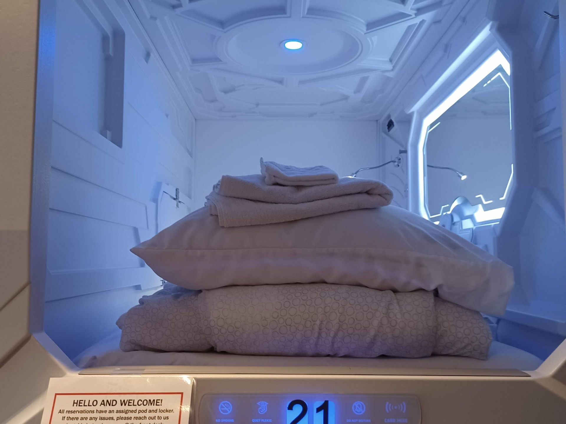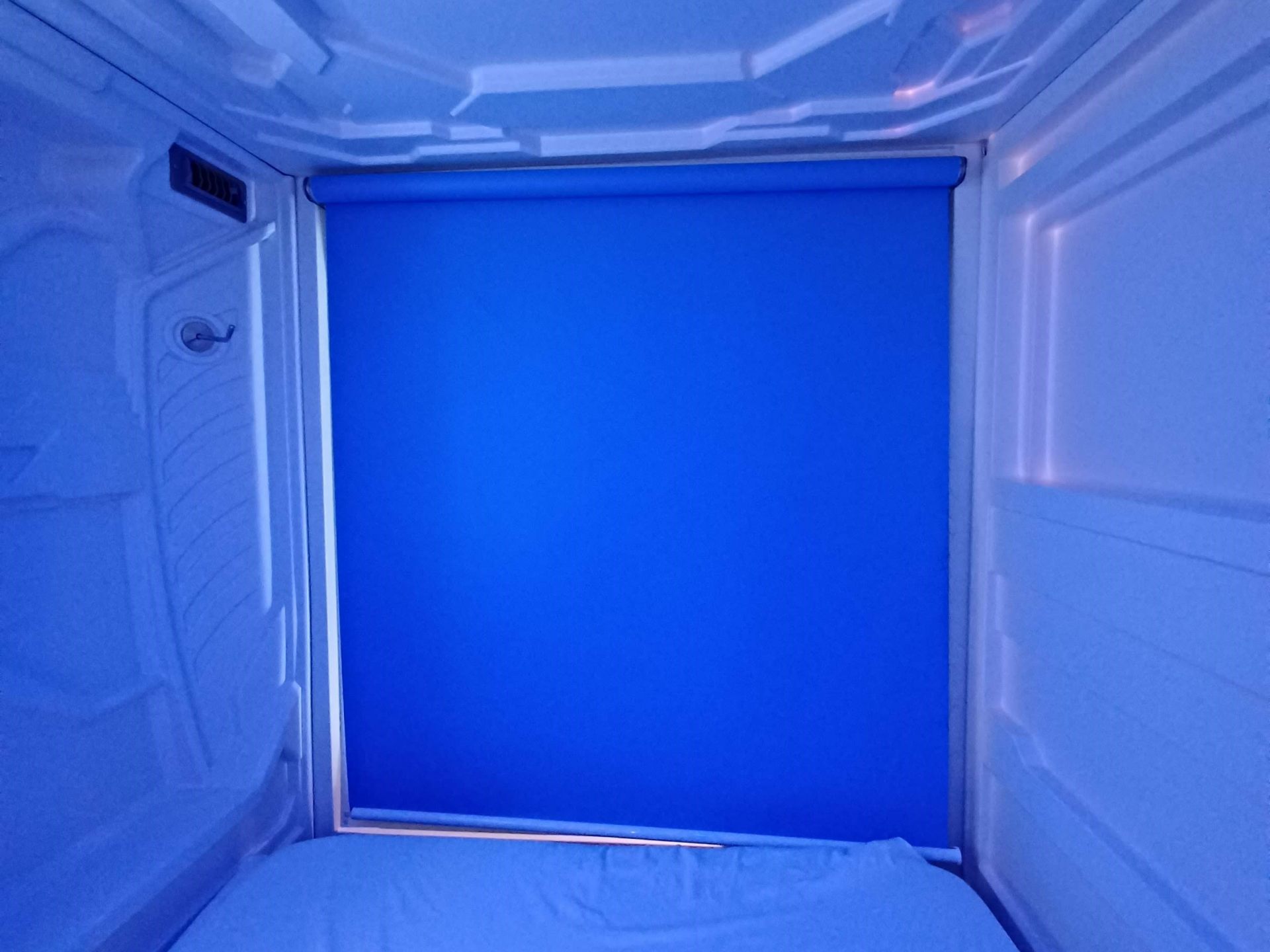 カプセルの上段へは楕円形の足場のあるはしごを使って上がりますが、やや斜めの位置から出入りするので、慣れるまで少し工夫が必要かもしれません。下段を希望する場合は、予約時にリクエストを出しておくと優先してくれます。