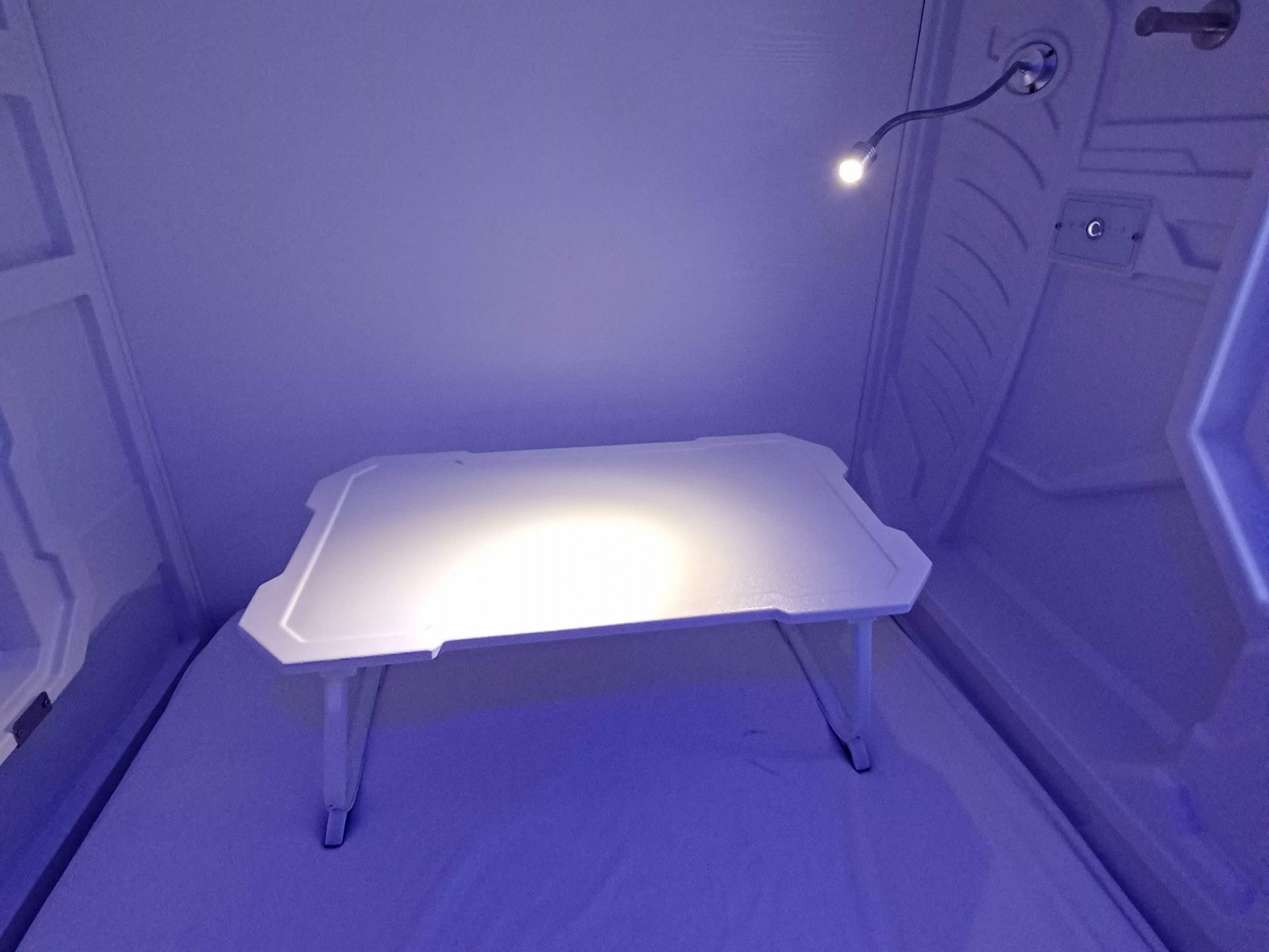 カプセルの中は近未来の宇宙船のようなデザインで、USB-Aタイプのコネクターが2か所あるので、スマホの充電などができます。コンセント(※アメリカでは“Outlet"と呼びます)は部屋の壁に共用としてあります。(日本と同じAタイプですが、電圧は120Vです)