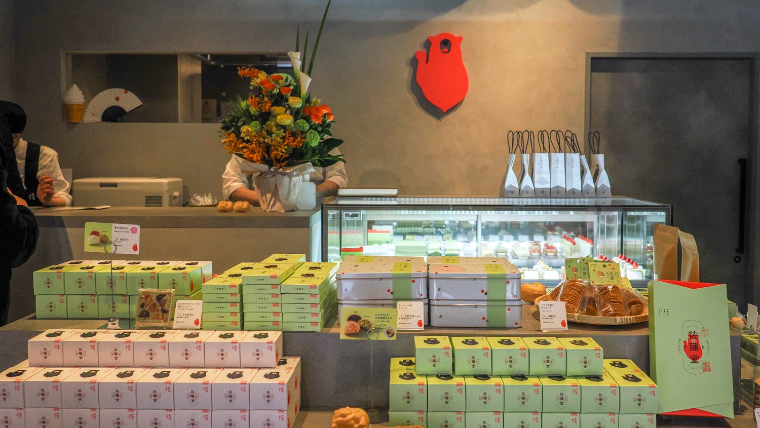 ビル1階の「佐藤堂本店」エントランスを入ると、ピスタチオをモチーフにした佐藤堂のオリジナルお菓子がずらりとならんでいます。