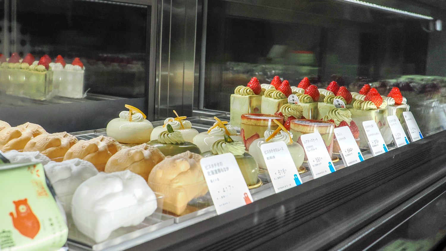ショーケースには、ピスタチオ色のケーキがずらり。