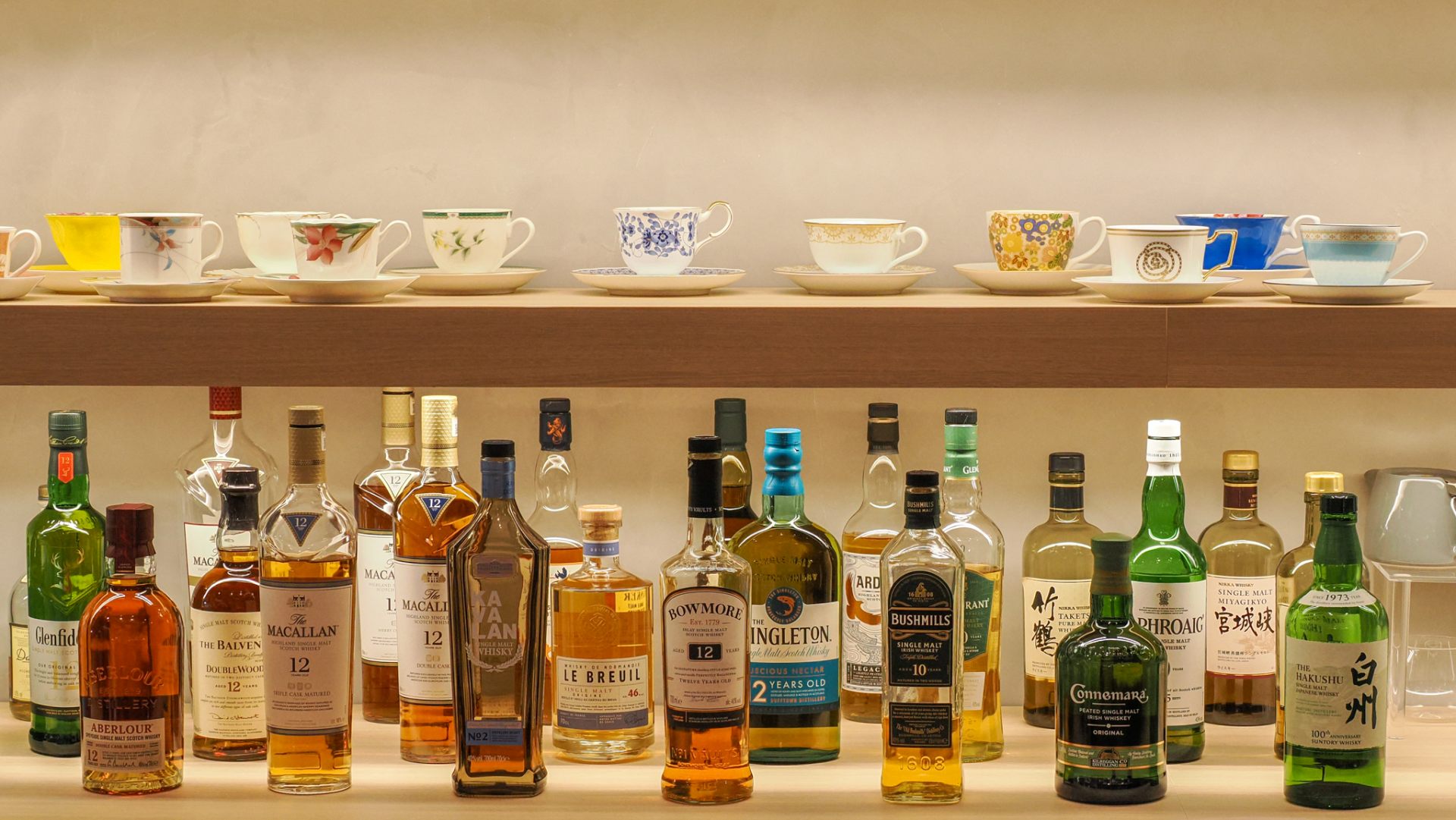 カウンターの向かい側に並んでいるのは、20種類以上のデザインのコーヒーカップとさまざまな種類のお酒。