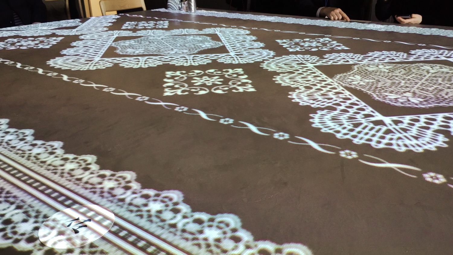 無数の金魚が泳いできたり、カエルやカメもスイスイ泳いでいたり、グレーの大きなテーブルが、一瞬にしてアート作品に変身します。