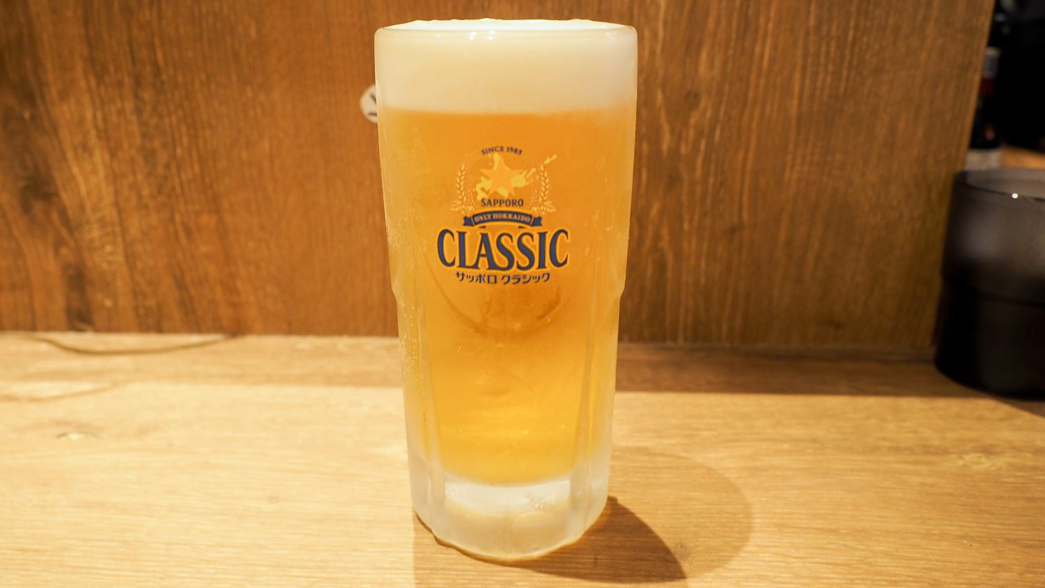 お酒はサッポロクラシック(583円)、日本酒(1合539円)、角ハイボール(473円)のほかノンアルコールビール(418円)などがあります。