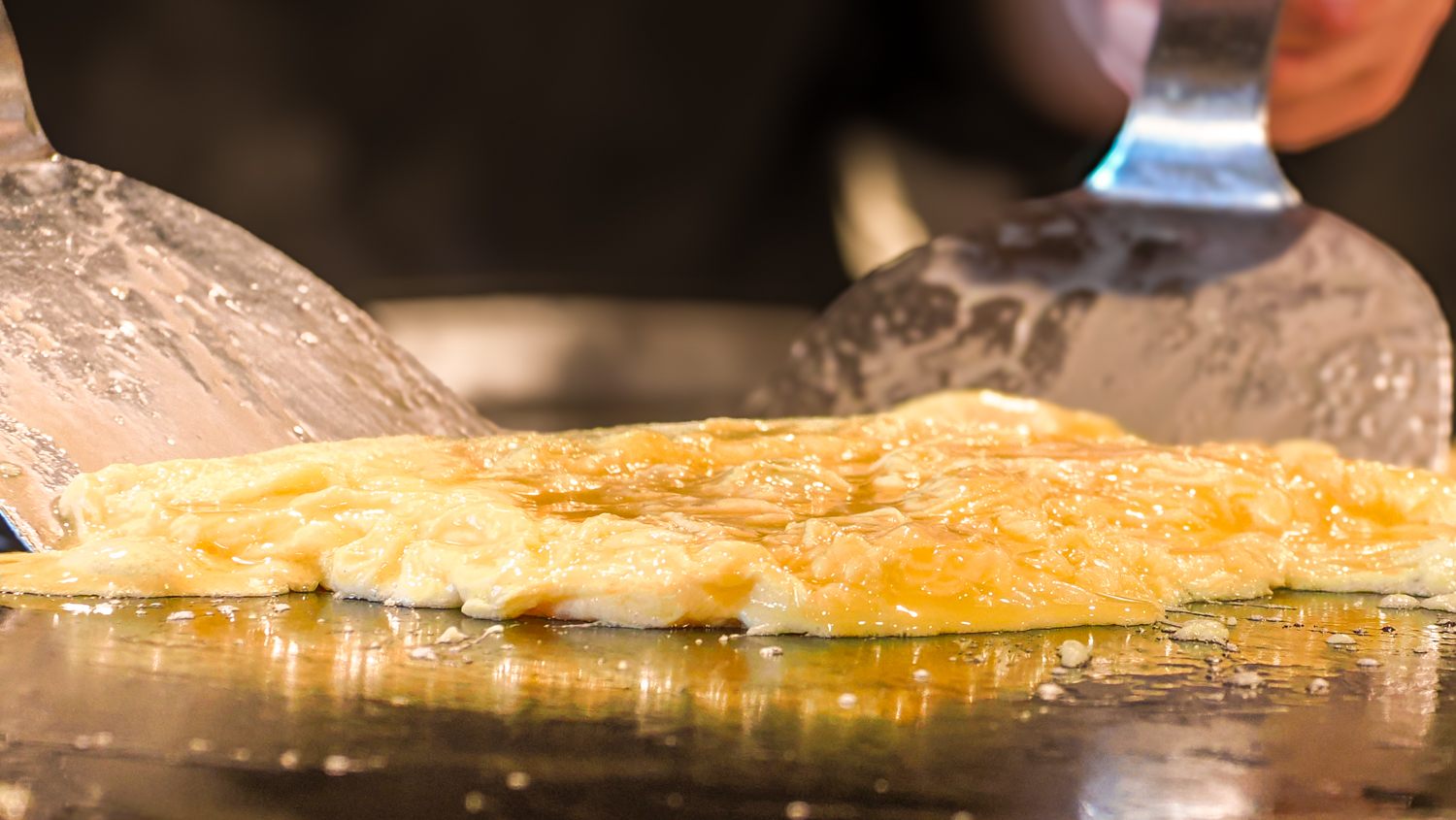 ですが、ジュワっと鉄板の上に流し込まれた卵液は、おいしそうな音を立てながら、見る見るうちにオムレツの形になっていきます。