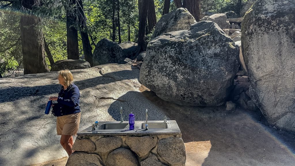 水飲み場と、トイレは利用可能となりました。ヨセミテハイキング中に用便が必要になったら、水路/トレールから100Feet(30m)離れて、15センチの穴を掘って行ってください。トイレットペーパは持ち帰るのがルールです(高地でバクテリアが少なく紙を分解してくれない為)