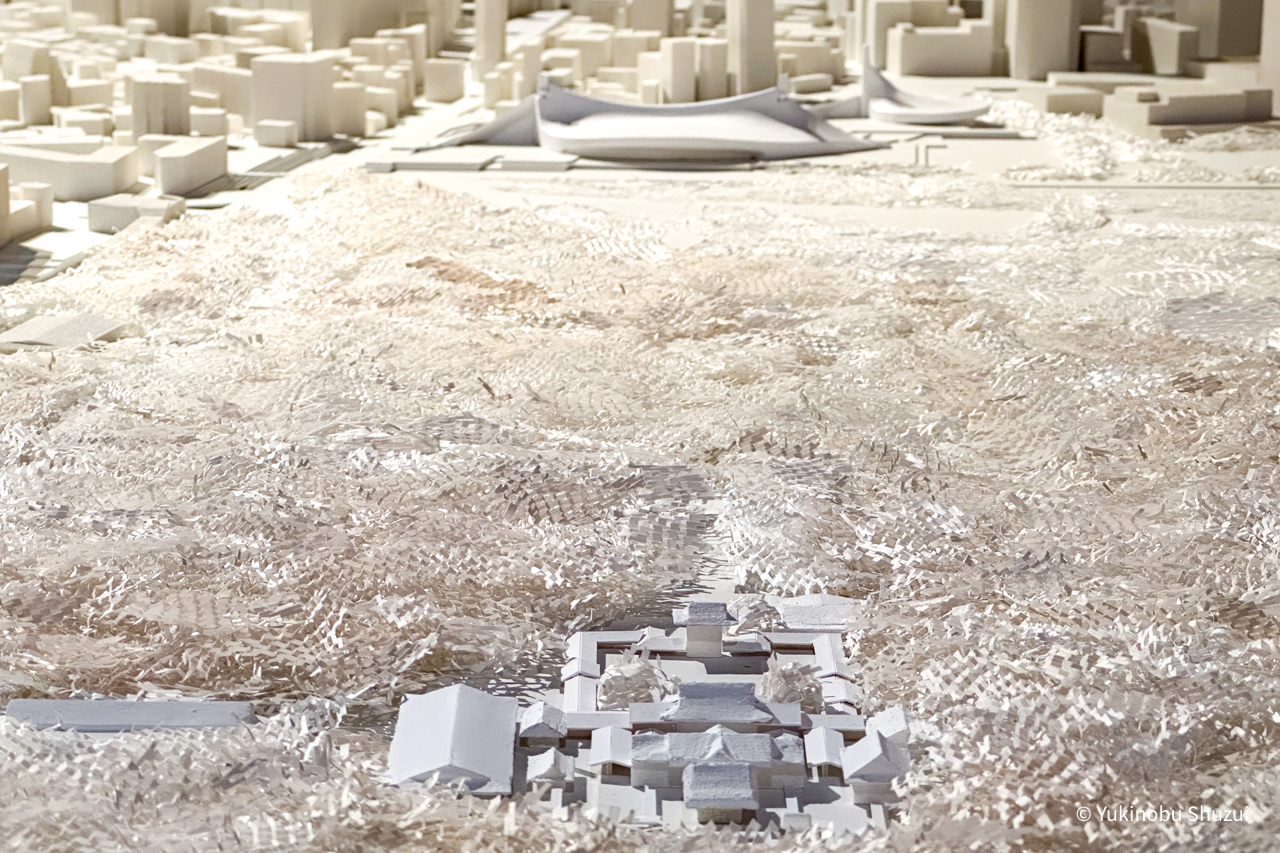 次に、マクロ的な視点から両者の建築を見ていきます。展示室一面に広がるのが、日本から船で運んできた東京都中心部の巨大ジオラマ。国立代々木競技場と国立競技場の位置関係がよく分かります。