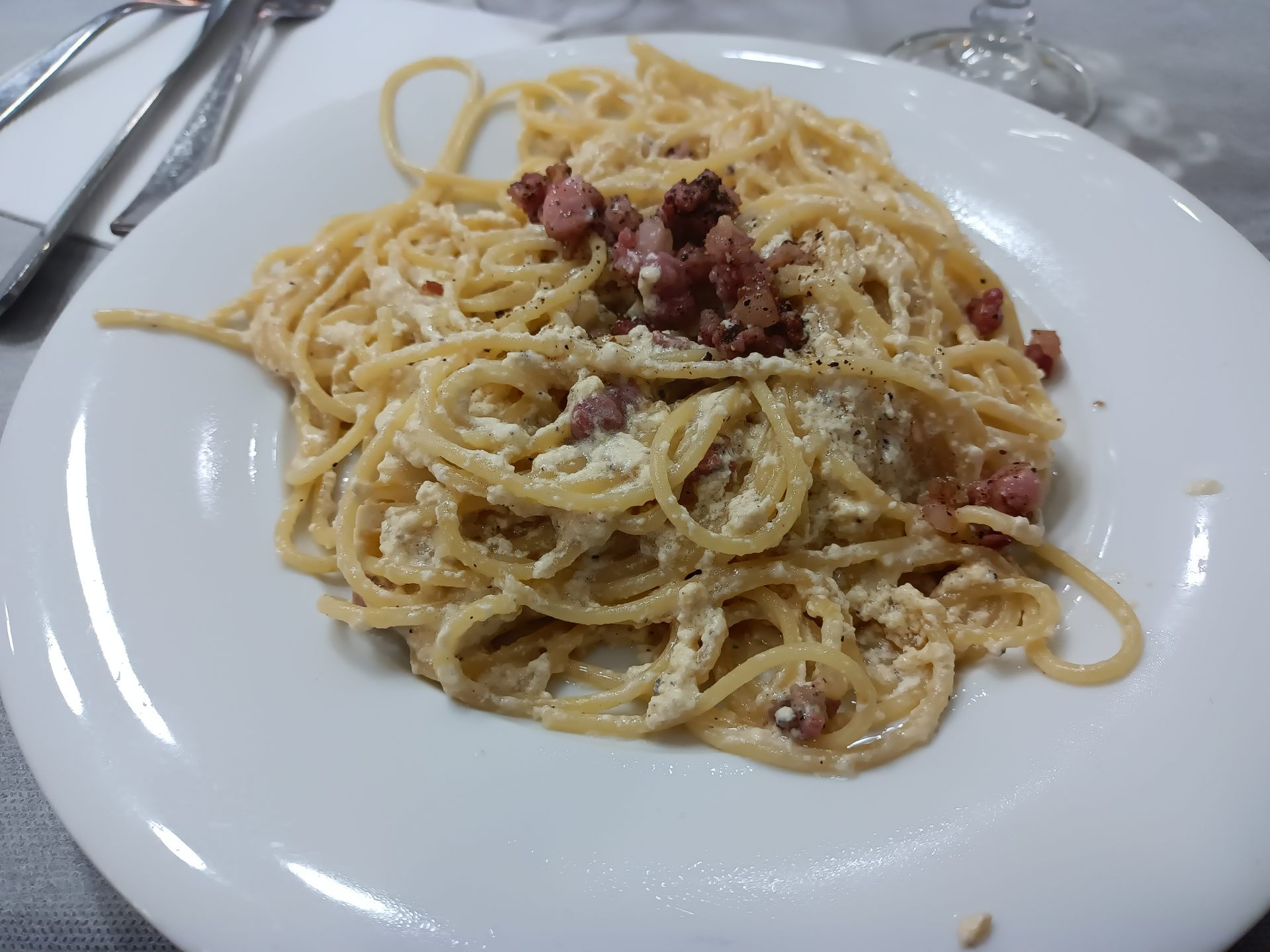 ナポリでカルボナーラはメニューにないところも多く、あっても味には期待できない感じでしたので、正直注文するのに迷いましたが、日本人は基本カルボナーラスパゲッティが好きな人が多いと思い、逆手にとって試しに注文してみますと、意外とおいしかったのでラッキーでした。
