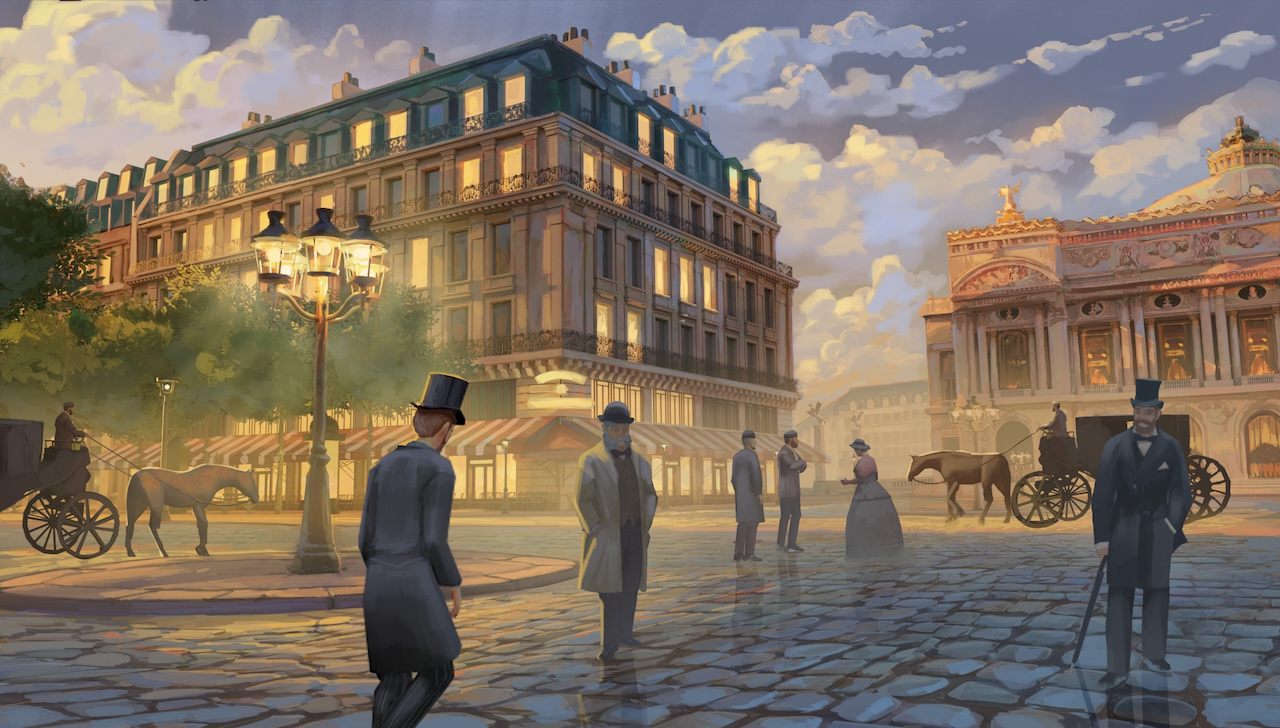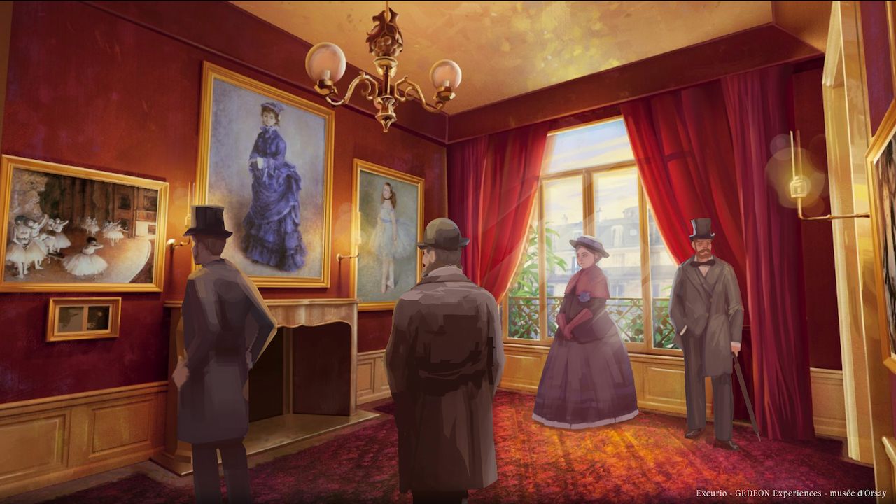 内容は、ナダールのアトリエで開かれた第1回展覧会のヴェルニサージュ(オープニング)に参加。順に案内してもらいながら、そこに居合わせるモネ、ピサロ、ルノワール、デュガなどと交流して、当時の様子を疑似体験できます。1874年4月15日の午後8時、夕暮れのパリ市内カプシーヌ通り。今も面影が残る街並みを窓の外に眺めながら、これからフランスの画壇を席巻していく印象派画家たちが、理想に燃えて登場します。