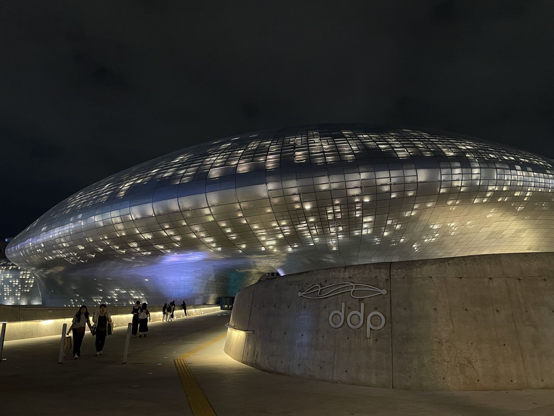 DDPとは東大門デザインプラザの略でアートホールやミュージアムのある施設です。20時までオープンなので、夜遅くに訪れた私たちは外観の夜景を楽しみました。
