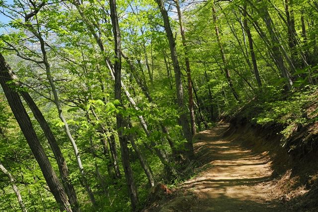 山頂を後にし、希望の道経由でお花畑コースへと合流します。新緑に響く小鳥のさえずりと沢を流れる水音がとても心地いいひと時です。