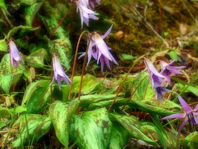 日の当たらないところに咲くカタクリは、クリスマスローズのようにうつむき姿です。日があたると花弁をクルント外に向けてカタクリらしい姿になります。