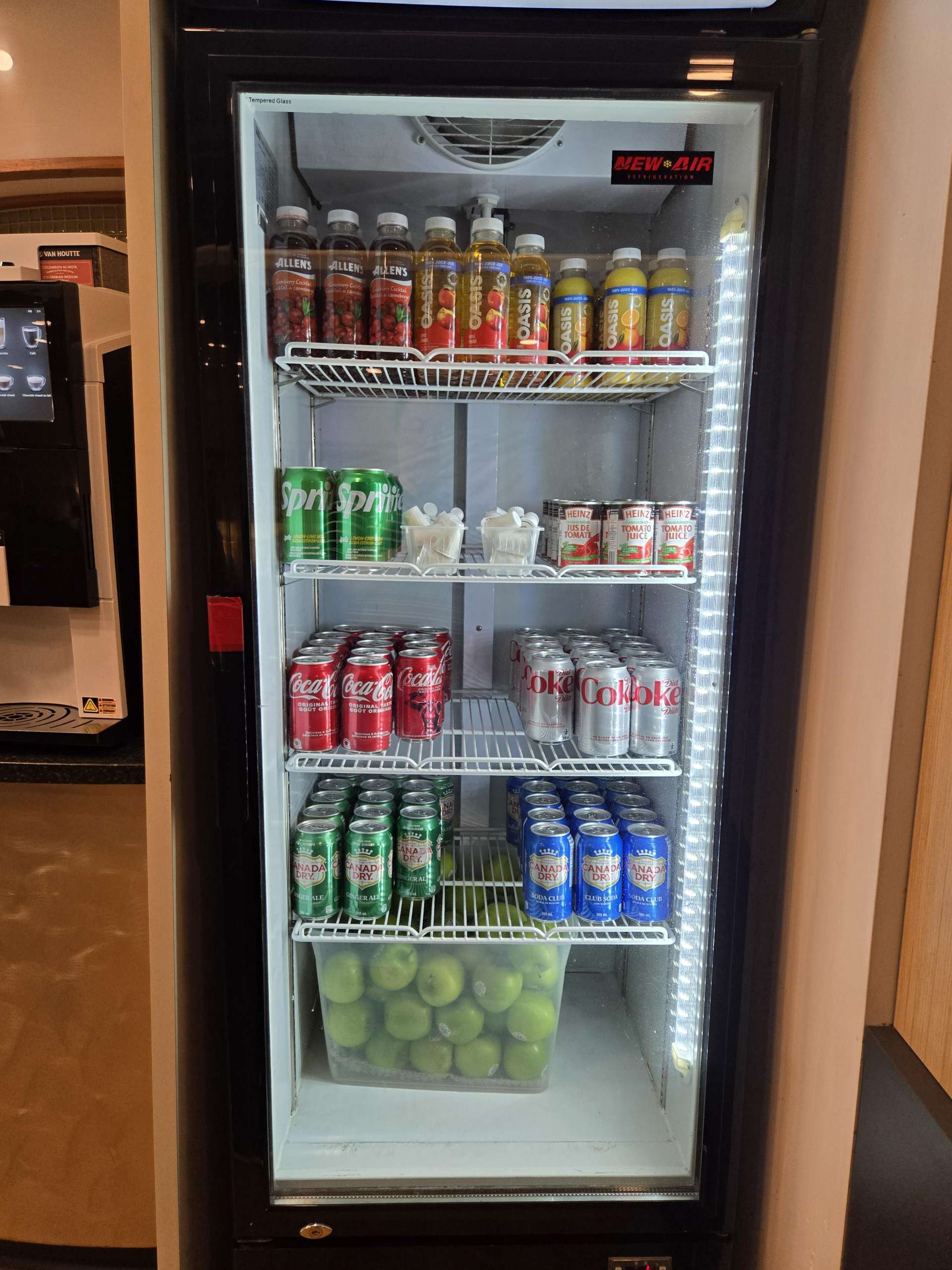 ラウンジ内、右手中央に飲み物や果物がおかれています。お手洗いもラウンジ内にありますので、荷物を置いたままトイレに行くことが出来ます。