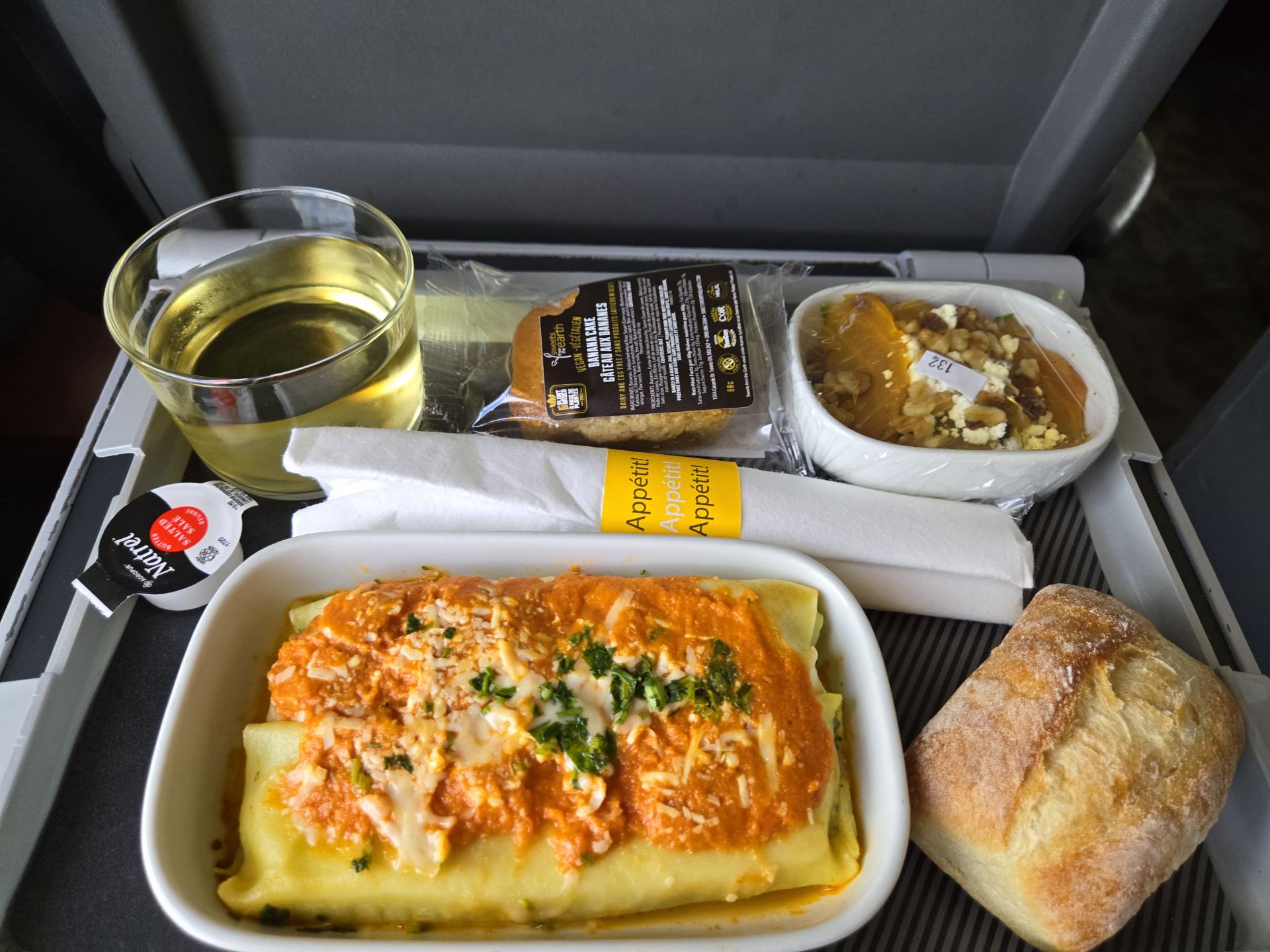朝出発の便だと1時間後くらいに、ビジネスでは軽食が提供されます。