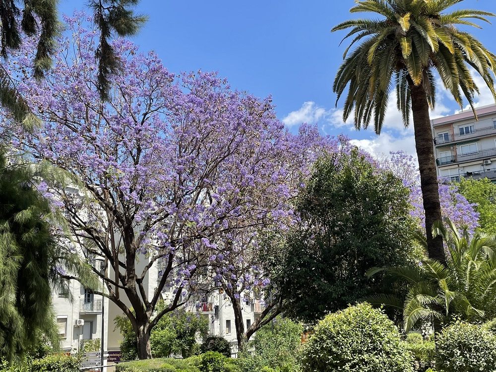 中南米原産で藤色の花が咲いた様子が美しいジャカランダを見るなら、ビベロスと呼ばれている庭園ハルディネス・デル・レアル(Jardines del Real)。ここにはとても大きなジャカランダの木があり、その下にバルのテラス席があるのです。今年は2回行きましたが、どちらも満席で座ることができませんでした。ジャカランダを見るなら、ブラスコ・イバニェス大通り(Avenida de Blasco Ibáñez)がこの庭園に突き当たるところにある門から入るとわかりやすいです。園内にはほかに何本もジャカランダの木があります。