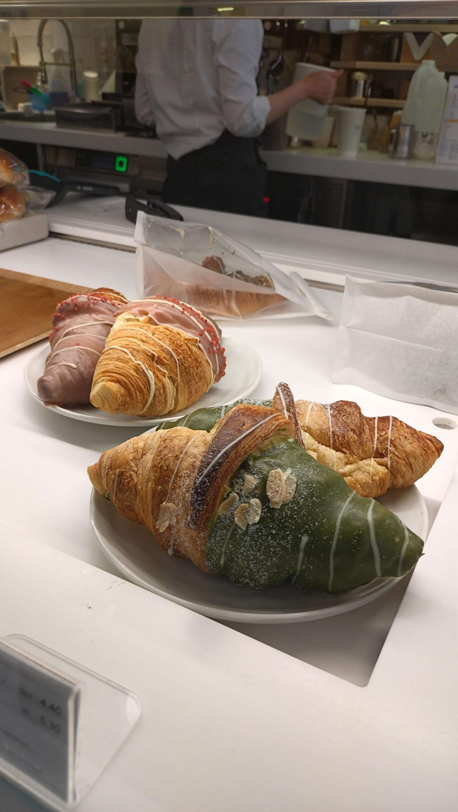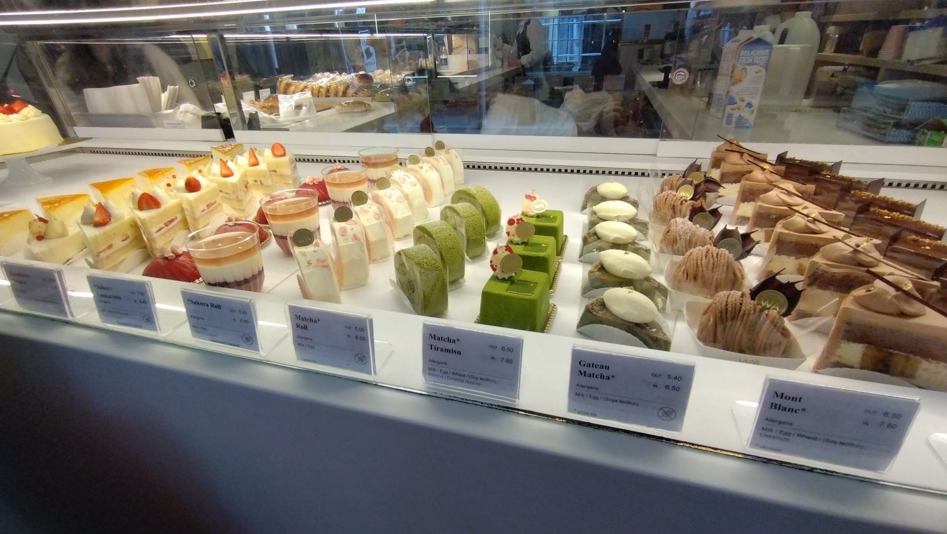 店内は、日本のケーキ屋さんを思い出させてくれるような、シンプルで綺麗に陳列されたケーキのディスプレイが印象的でした。ヨーロッパでは、小ぶりのショートケーキやロールケーキが並んでいて、どれも宝石のようにキラキラ。見た目も繊細で綺麗なので、選ぶのにかなり迷ってしまいました。